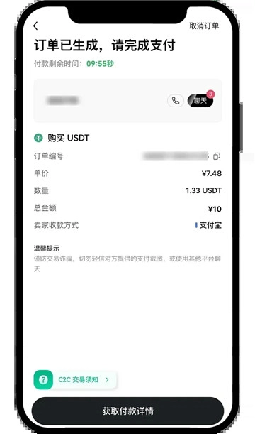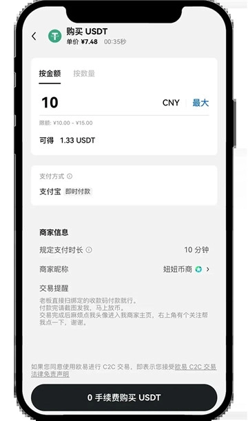 二、挑选可交易的商家开展购买活动 - 根据金额或数量填写所需的数字资产 - 留意商家规定的“支付方式” - 留意商家规定的“支付时长” - 点击“0手续费买入” - 订单生成后点击“获取付款详情” - 依据“商家账号”进行支付 - 付款成功后点击“我已支付” - 点击“确认已转账” - 商家收到款项后会进行放币操作。