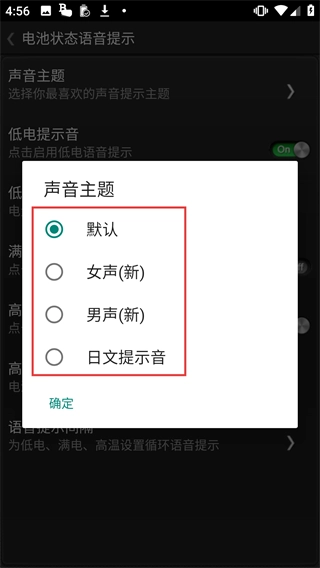 你可以从声音主题列表里挑选心仪的主题,列表里有默认、女声(新)、男声(新)、日文提示音这些选项,选好之后点击【确定】按钮,这样就完成声音主题的设置啦。