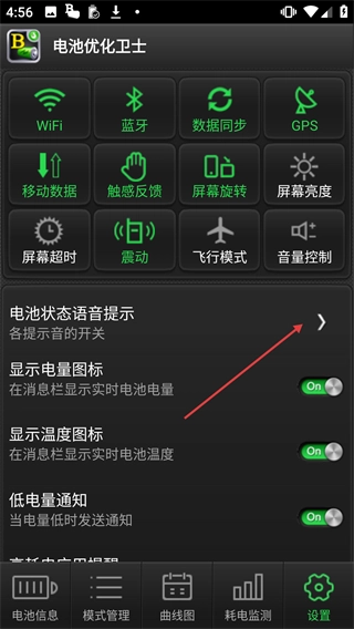 在设置界面找到并点击【电池状态语音提示】选项,即可进入对应的语音提示设置页面。