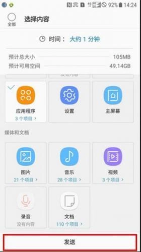 12、在旧设备上选择要传输的内容,勾选想要传输的文件后,点击【发送】。