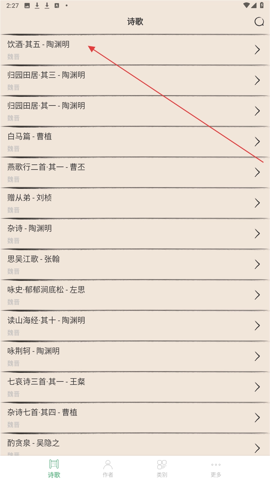 打开古诗三百首应用后,进入诗歌列表页面,找到自己感兴趣的诗歌并点击,比如《饮酒·其五》。