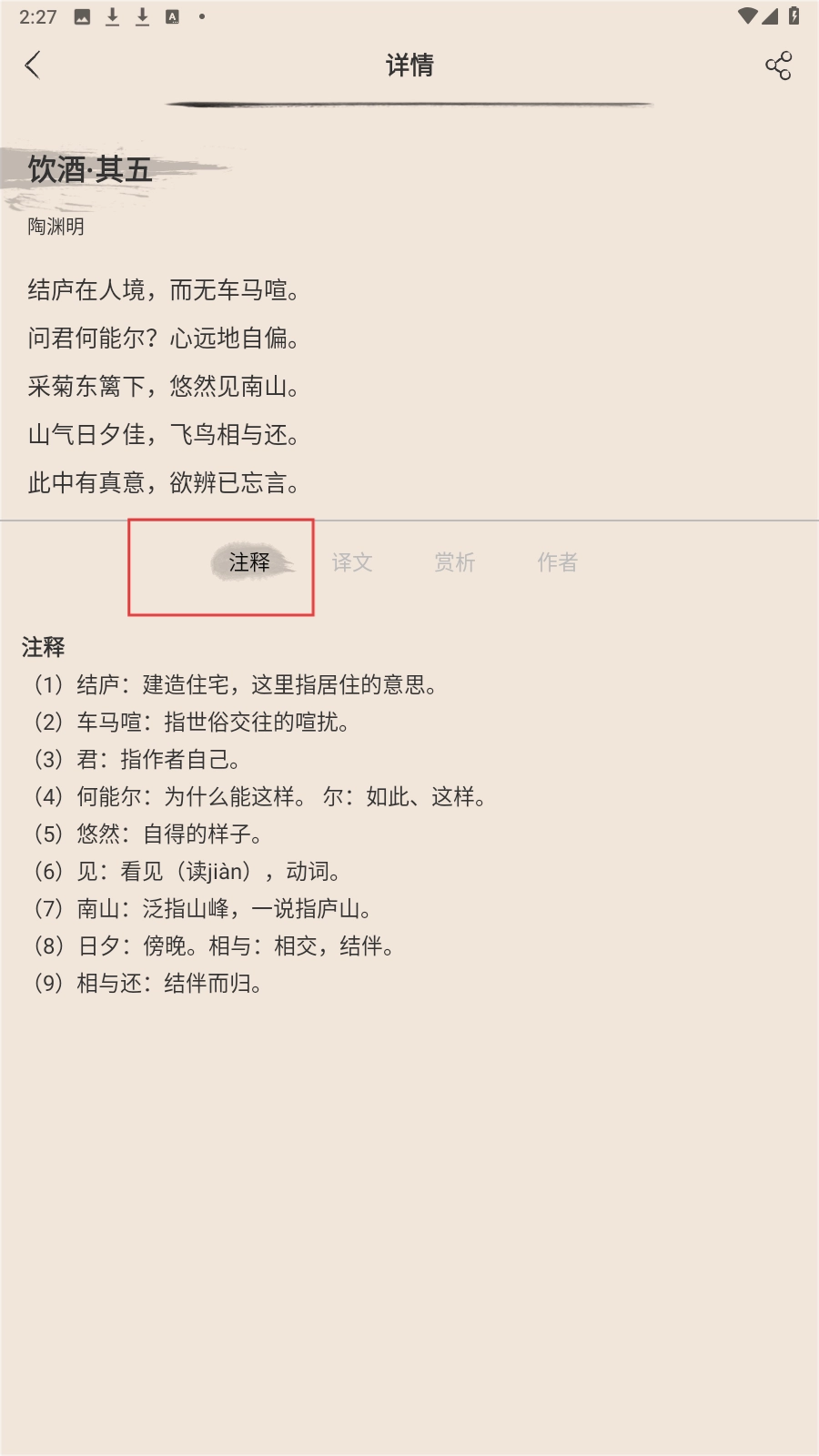 进入诗歌详情页面,可查看诗歌原文、注释等内容。
