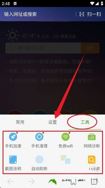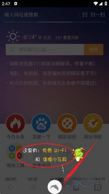 点击界面上的小海豚图标,会弹出带有免费WiFi工具和清理工具的选项。