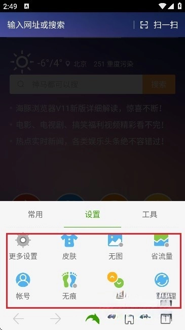 完成海豚浏览器的安装后,打开该浏览器,然后进入【设置】选项。