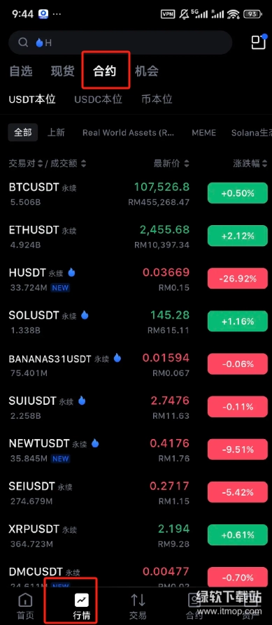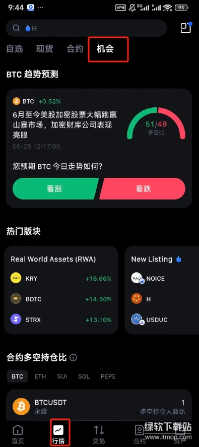 行情界面包含了自选、现货、合约、机会四大板块