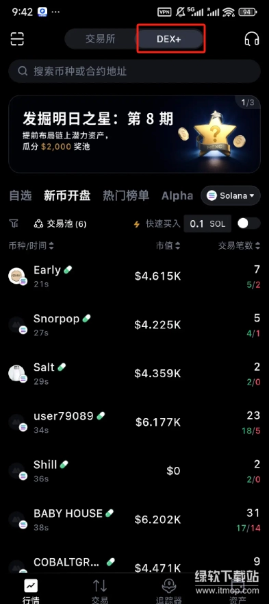 进入手机内,首页界面交易所与dex可以进行切换,能在首页界面看到币种的各种最新情况