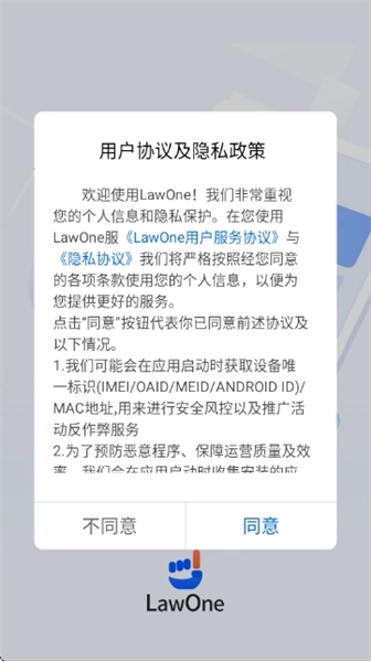 打开后,阅读《LawOne用户服务协议》与《隐私协议》,点击“同意”进入主界面。