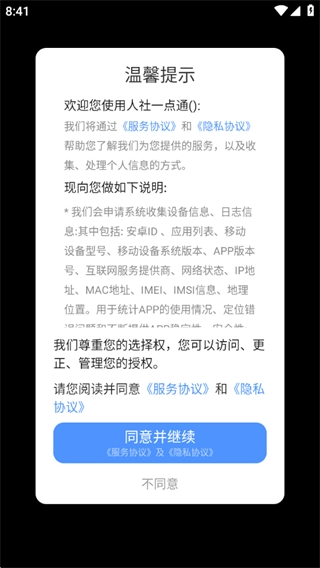 1、阅读服务协议和隐私政策之后点击同意并继续;