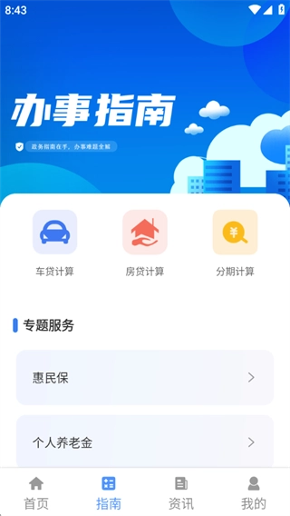 3、提供办事指南,能够进行车贷计算、房贷计算,还有专题服务;