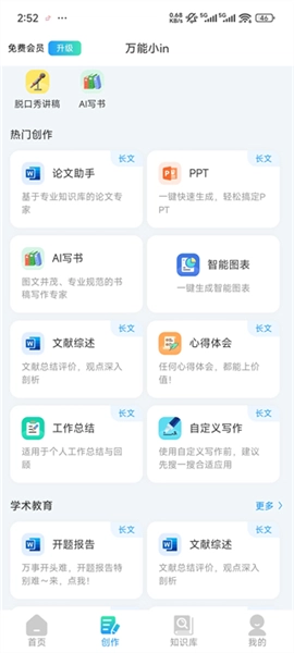 3、也可以点击创作板块,这里有各类模板,像【AI创作、PPT、智能图表、工作总结等】,能直接生成完整稿件,点击就能使用【需升级会员方可使用】
