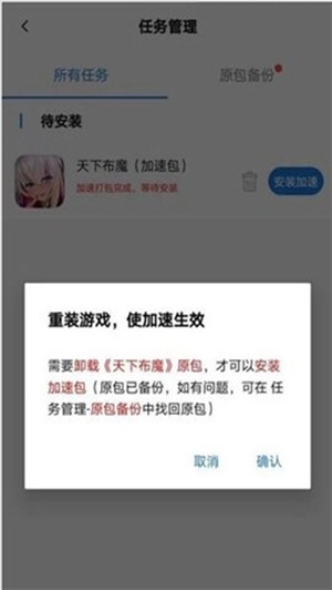 2.通过自动处理目标游戏,产生一个备份安装包和加速安装包,卸载目标游戏并安装加速安装包来生效。