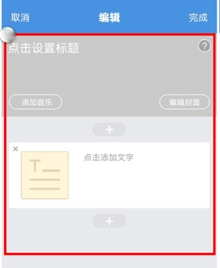4、进入编辑界面,可为文章“设置标题”、“添加音乐”、“添加封面”、“添加文字”、增加文字、图片、视频,点击“完成”即可完成文章的设置;