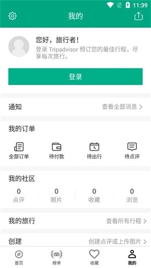 1、点击 Tripadvisor 主页顶部的“行程”图标,选择右下角的加号“创建行程”。