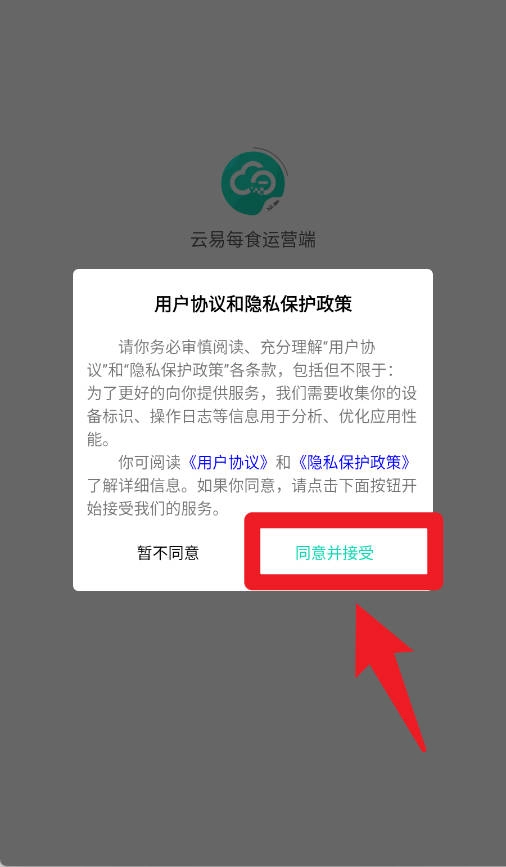 1、进入后,页面会首先展示用户协议与隐私保护政策,点击“同意并接受”,就能继续进入系统,以保障后续功能能正常使用。