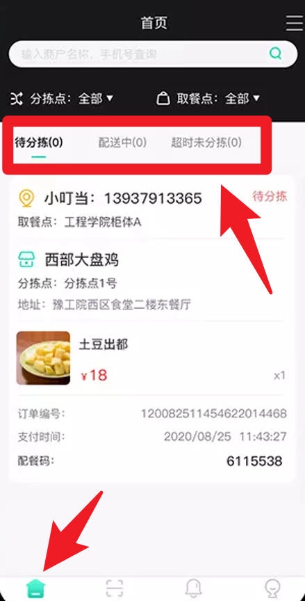 4、于订单界面,能够查看待分拣、配送中以及超时未分拣的订单相关信息,从而实时把控订单动态,提高配送管理效率。