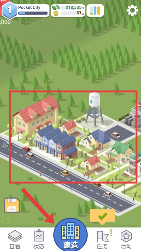 4、轻点【建造】按钮,从中挑选住宅区开展建造工作,依照任务要求循序渐进地完成,在此过程中,时刻留意城市人口、资金等资源的变动情况。