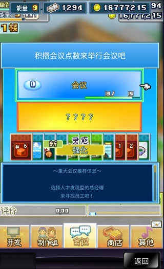 会议室是获取优质创意的关键场所,建议频繁使用以积累更多灵感点子,这些都将直接影响后续游戏的质量与创新度。若当前点数不足,可通过日常开发任务或使用特定道具来补充会议能量。