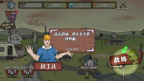 1、游戏模式依旧采用熟悉的闯关制,如图所示,点击战场,进入关卡选择界面。