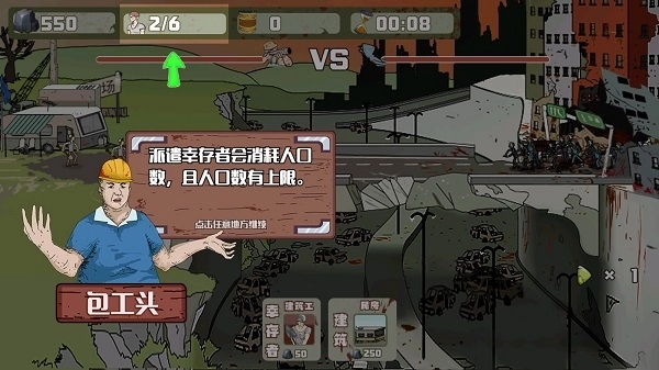 幸存者的类型取决于场上建筑物类型。在矿石资源的旁边,显示当前人口数的上限,通过建筑民房可以提升上限。