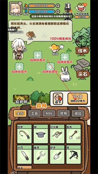 4、点击下方工具中的斧子,然后点击砍伐按键消耗20点体力值获取3块木头。