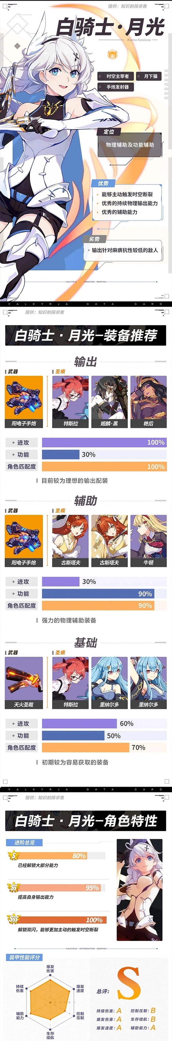 这是一个定位在战场环境下的功能性角色,前期阶段作用比较有限。需要提升到SS阶级才能解锁其主要的输出能力,SSS阶级则会解锁双闪避机制。该角色对超限武器的依赖度较高,建议在账号等级达到81级之后再考虑投入资源进行培养。