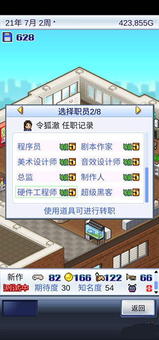 《游戏发展国免登录版》是一款经典模拟经营游戏,为玩家打造了一个极具挑战性的游戏世界,拥有诸多独特亮点:精致的画面与音效、丰富的内容和玩法,还有各种趣味剧情与任务。玩家可以自由选择开发不同类型的游戏进行挑战,同时需要招募员工、制定公司战略、研发游戏、推广游戏等,通过持续努力,成为最具人气的游戏开发公司。