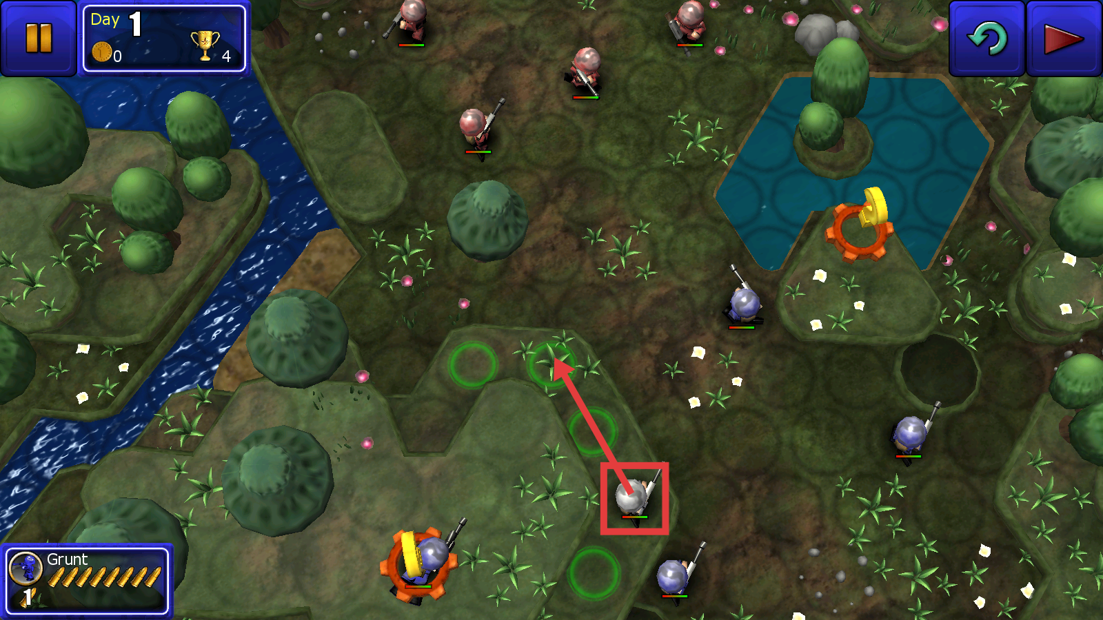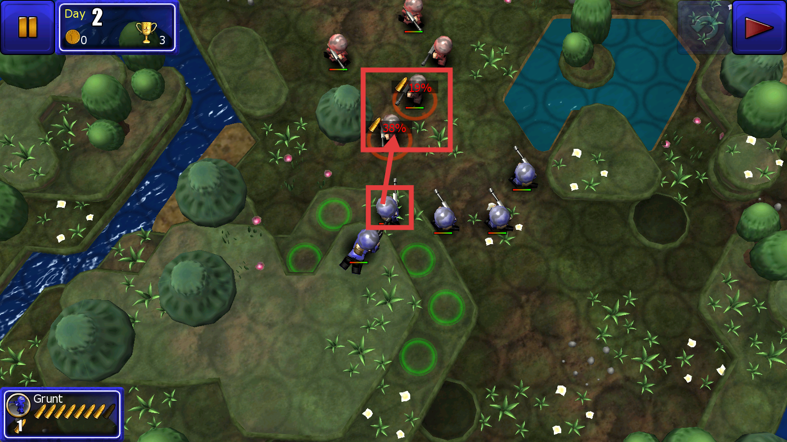 在战场上留意士兵显示的绿色可移动范围,把士兵安排到绿色区域内,以便为接下来的作战行动做好准备。