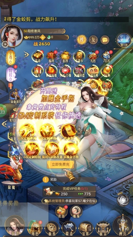 充值比例为1元兑换500元宝,开局即可获得VIP10等级与88888元宝福利。