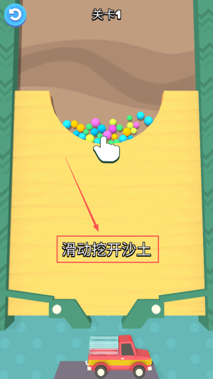 看到提示「滑动挖开沙土」后,按住屏幕拖动以开辟通道,使角色顺着斜坡滑落。