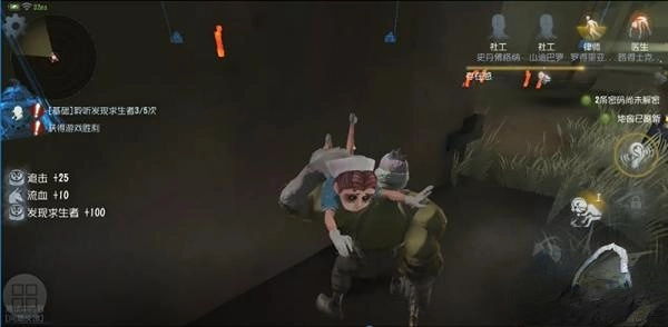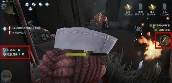 当被监管者砍伤后,医生能借助技能进行自我治疗。由于治疗过程需要一定时间,所以尽量在远离监管者的地方使用该技能。下面图片的左侧区域是积分显示部分。
