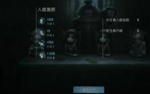 游戏结束后会显示本次匹配赛的个人表现,点击继续后会呈现本次匹配赛个人表现对应的人格修复和天赋点,查看完这些信息后我们即可返回大厅,一次推演也就此结束。
