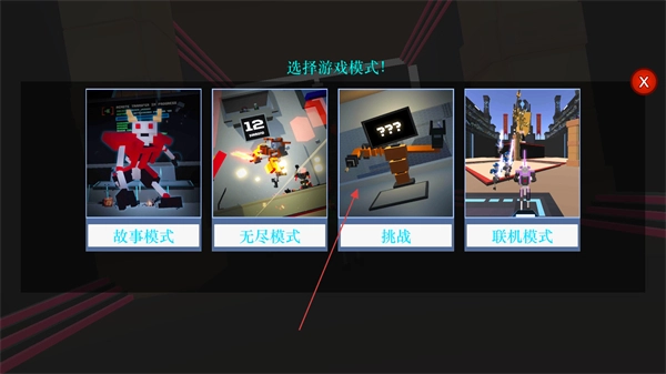 打开机器人角斗场这款游戏,接着点击开始游戏,选择对应的游戏模式后就能进入挑战环节了。