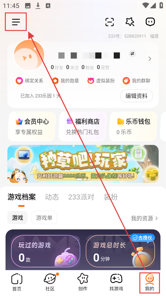 我们进入【我的】页面后,点击左上角的三条横线图标,即可展开侧边栏,查看更多功能选项。