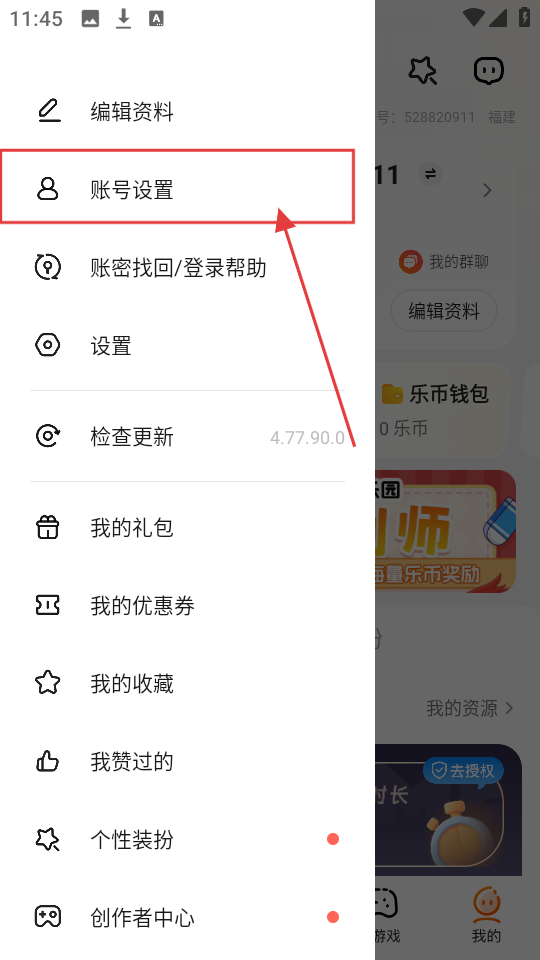 在展开的侧边栏中,点击【账号设置】选项,即可进入账号相关的设置页面。