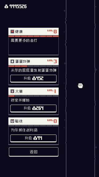 另外在游戏中击杀怪物可以获得金币和道具,用你的战利品交换邪恶强大的能力。比如增加血量,购买蛋蛋炸弹和火箭,这样你就能让这些恶魔们见识见识,谁才是真的老大!