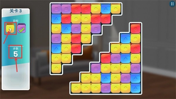留意左侧的目标,当显示【黄色-7】时,借助剩下的【步数-5】,高效清除剩余方块,达成收集目标。