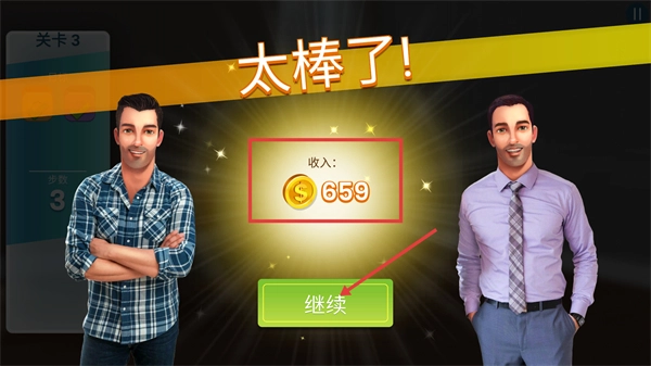 通关后获得【收入-659】金币,点击【继续】按钮,开启下一关消除挑战,积累更多金币。