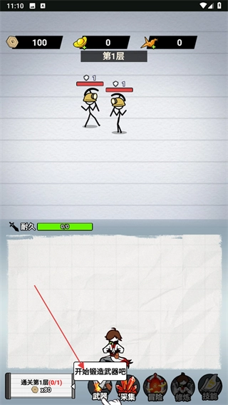 1. 打开游戏后,留意屏幕上方的资源数值,像金币数量为100以及当前所处层数是第1层,接着点击屏幕下方,就可以开始锻造武器啦。