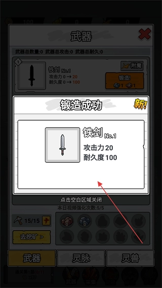 2、在武器界面,选择锻造武器,比如铁剑,消耗对应资源点击锻造,提升武器攻击力和耐久度。