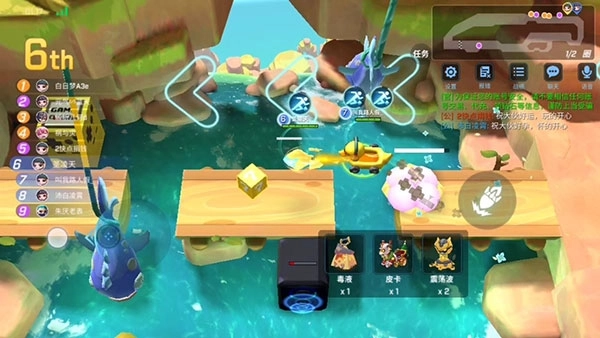 这片区域分为两个部分,障碍都是摇摆类型的(在逃跑吧少年中被称为“咸鱼大摆锤”)。如果在较低的水面上使用跳跃类道具,会受到攻击。从桥上通过是一个不错的选择,走水面也是可行的。第一部分可以通过捣弹和皮卡的高速度直接穿过摆锤之间的空隙,但要小心不要被击中。使用跳跃或滑板也可以越过摆锤,不用担心绳子会造成伤害。第二部分如果想用车辆通过则需要一点运气,建议选择水路。如果走水路的话,可以使用飞爪抓住对岸的石头快速移动,或者利用震荡波向前推进。