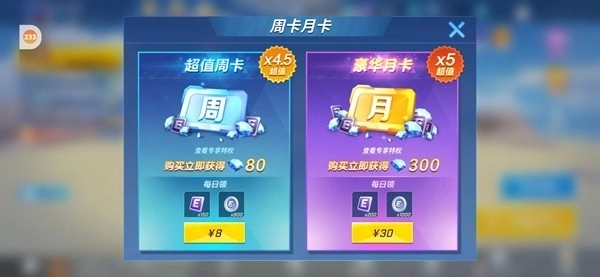 点击屏幕上方排行榜旁边的周卡月卡图标可以进入周卡和月卡的购买界面
