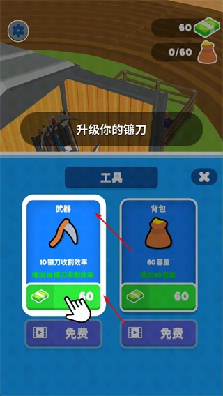 3、使用金币对镰刀和背包进行升级,提升农场劳作效率。