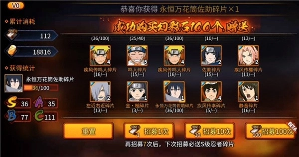 4、如果不满意招募的结果,我们可以再次10连,直到出现我们需要的忍者碎片。