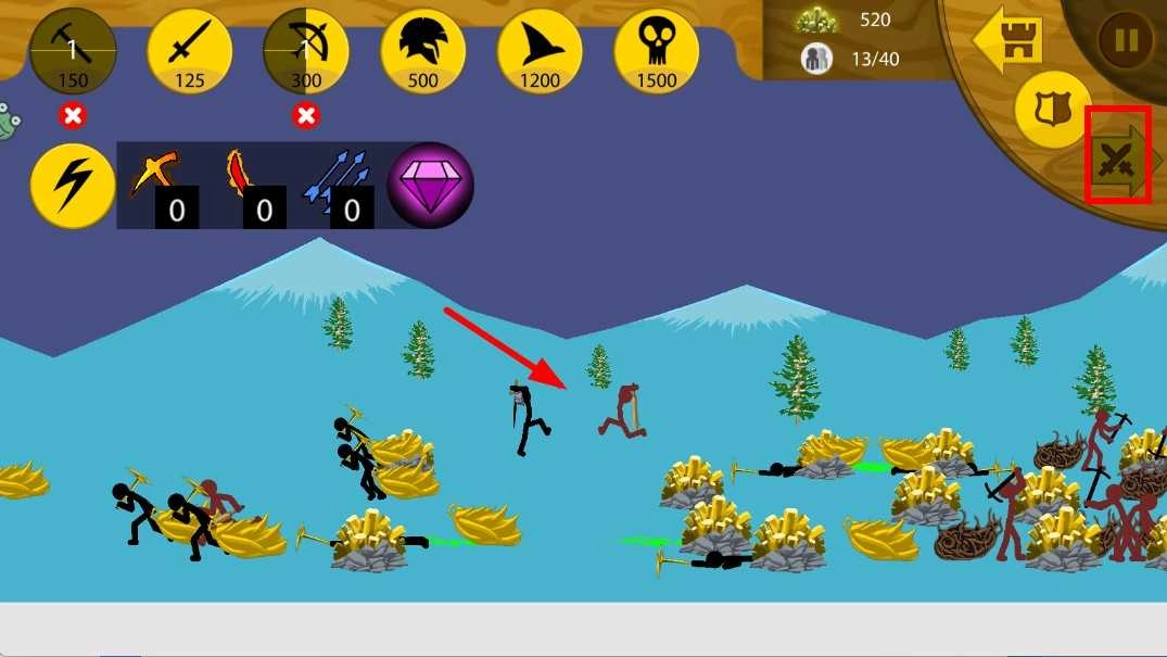 4、按照战斗需求,点击上方各类兵种图标,便能召唤对应的火柴人士兵,像弓箭手、持盾战士之类,以此壮大自身战斗力量,助力赢得胜利。