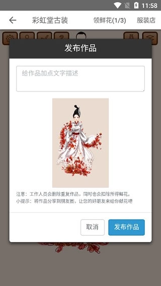 10、待完成换装后,点击左上方√按钮进行发布,并给予文字描述;