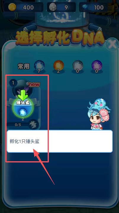 2. 在DNA选择页面,点击带有new标识的锤头鲨球体,孵化出1只锤头鲨,并展示资源数量。