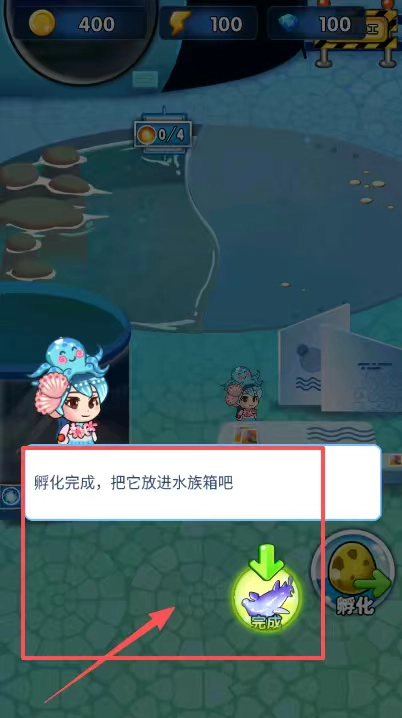 3、当孵化完成后,会弹出提示框,点击带有蓝色生物图案的完成按钮,接着将海怪放入水族箱,此时资源数据便可见。