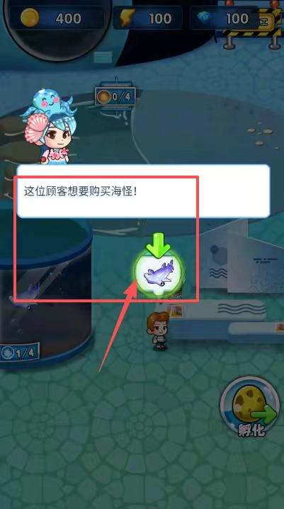 4、若水族箱有顾客想要购买海怪,点击绿色物品栏,从中选择海怪,接着按照箭头的提示,将海怪卖给顾客,以此来赚取收益。