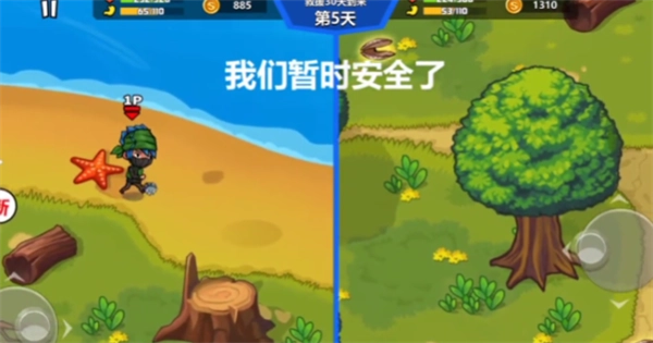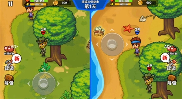 4、降落在荒岛上后,与朋友一同操控角色,在荒岛展开探索,砍伐树木收集资源,只要能安全度过30天就算通关。
