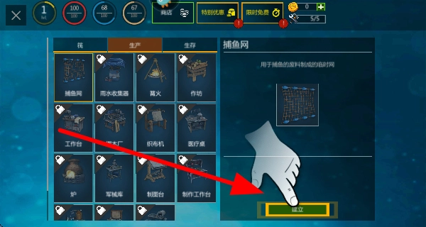 1. 在制作界面中,挑选如捕鱼网之类的物品,点击“建立”按钮,制作出相应工具,以此为海上生存及获取资源做好准备。